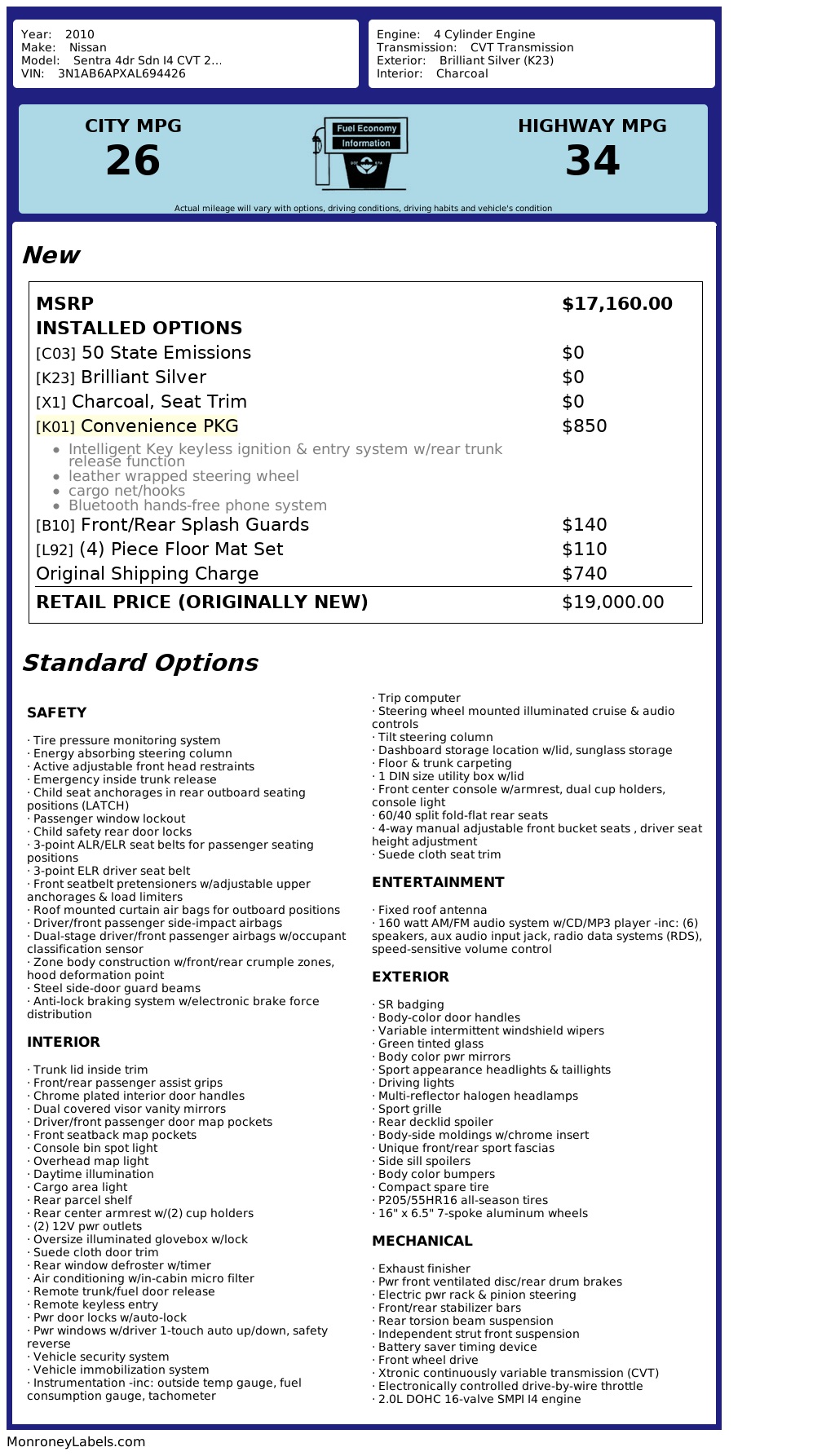 Looking for a ride that's as reliable as it is fun? Hop into this sleek Silver 2010 Nissan Sentra! Powered by a zippy 2.0L DOHC 16-valve engine and Xtronic CVT, it's perfect for cruising around town. The sporty appearance with side sill spoilers and rear decklid spoiler is sure to turn heads, while the roomy interior features comfortable front bucket seats and split fold-flat rear seats. Whether you're running errands or hitting the road for a weekend adventure, the trunk area provides plenty of space for all your gear. Stay entertained with the AM/FM audio system with CD/MP3 player and enjoy the convenience of steering wheel mounted controls. Plus, safety is a top priority with front, side-impact, and curtain airbags, along with features like ABS and tire pressure monitoring. Best of all, a Carfax report is available for added peace of mind. Don't miss out on this versatile and stylish ride - it's ready and waiting to hit the road with you!