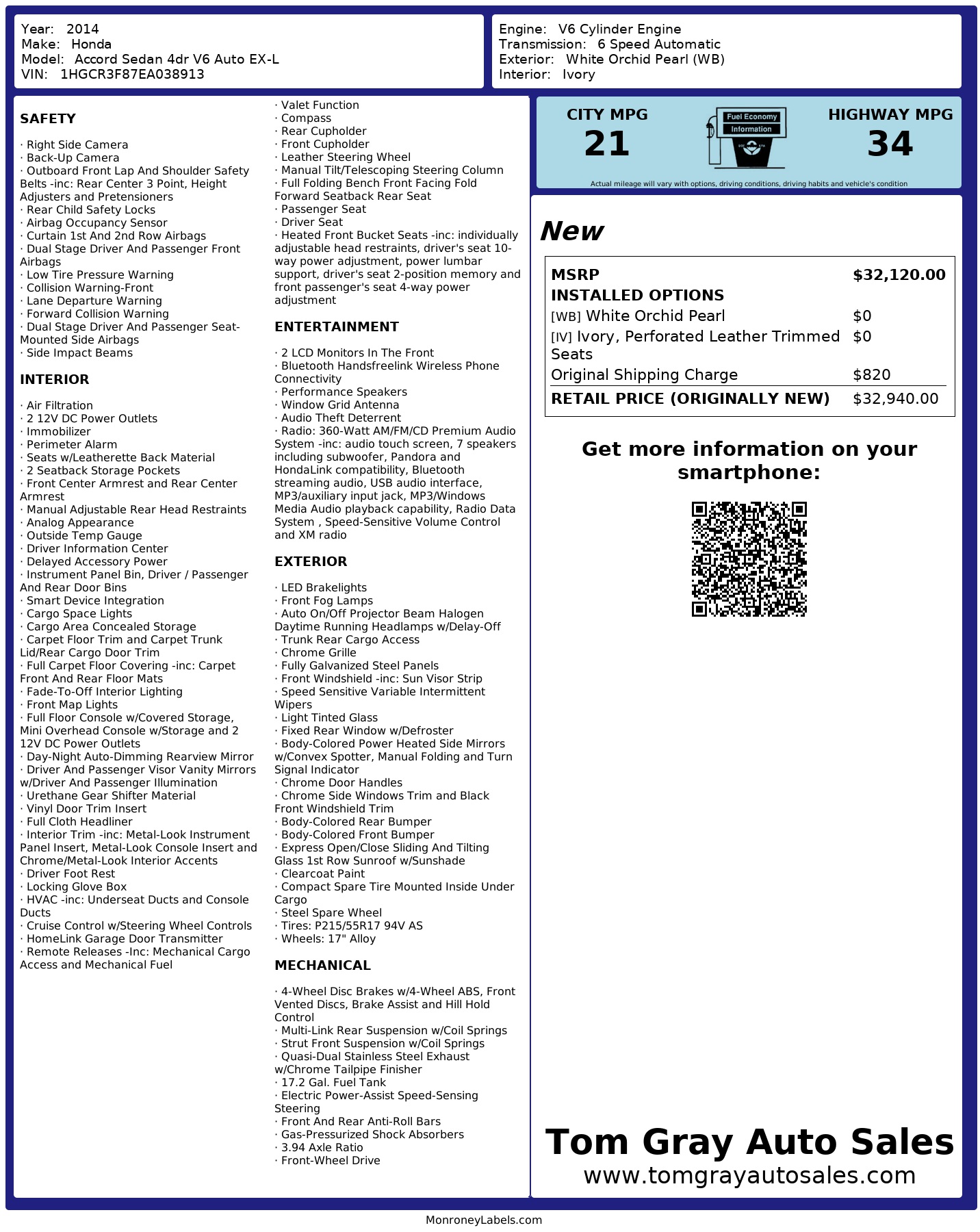 Get ready to hit the road in style with this stunning Pearl White 2014 Honda Accord Sedan! Featuring a powerful 3.5L V-6 engine paired with a smooth 6-speed automatic transmission, this sedan offers a thrilling driving experience every time you step behind the wheel. The sleek exterior is complemented by 17" alloy wheels, fog lamps, and a sunroof for those sunny adventures ahead.