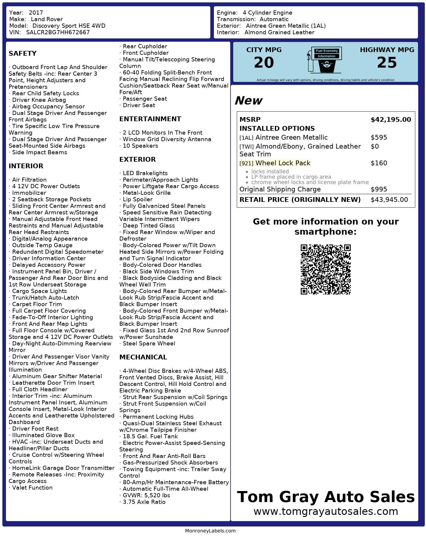 Ready for adventure in style? This Green 2017 Land Rover Discovery Sport is the ultimate combination of luxury and capability. Powered by a 2.0L I4 Turbocharged engine and a 9-Speed Automatic transmission with paddle shifters, this beauty is ready to take on any terrain. Step inside and you'll find a spacious interior with seating for five, complete with premium materials and advanced technology. The fixed glass sunroof lets in plenty of natural light, while the power liftgate makes loading and unloading a breeze. Safety is a top priority with features like side impact beams, dual stage airbags, and rear child safety locks. Plus, the Carfax report is available for peace of mind. Whether you're cruising through the city or tackling off-road trails, the Land Rover Discovery Sport has you covered. Don't miss your chance to own this versatile and capable SUV - it's ready to fuel your next great adventure!