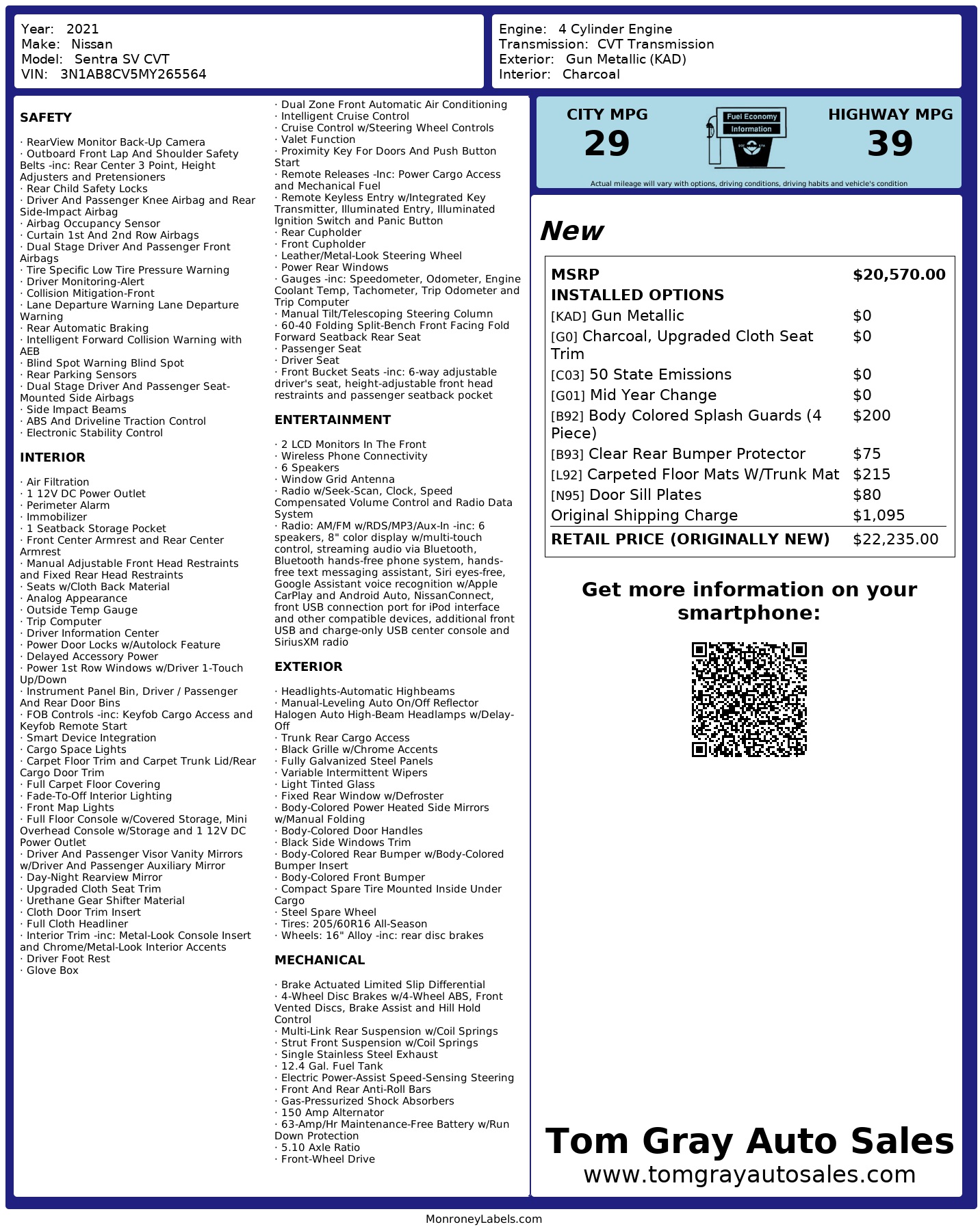 Hop in and buckle up for a joyride in this sleek and stylish 2021 Nissan Sentra! This sporty sedan is powered by a spirited 2.0L DOHC 4-Cylinder engine paired with a smooth Xtronic Continuously Variable Transmission, ensuring a seamless driving experience every time you hit the road. With front-wheel drive and a responsive steering system, you'll effortlessly navigate through city streets and highways with confidence. Step inside the spacious cabin and sink into the comfortable front bucket seats, surrounded by premium cloth upholstery and modern interior accents. Equipped with Intelligent Cruise Control, dual-zone automatic air conditioning, and a remote release for convenience, this Sentra offers a luxurious driving experience for both driver and passengers. Safety takes the front seat in this vehicle, featuring Blind Spot Warning, Intelligent Forward Collision Warning with AEB, and Rear Automatic Braking for peace of mind on every journey. Plus, with Rear Parking Sensors and a RearView Monitor Back-Up Camera, maneuvering in and out of tight spots is a breeze. Worried about the car's history? Don't stress, a Carfax report is available for full transparency on this well-maintained beauty. Don't miss your chance to own this reliable and feature-packed Nissan Sentra - schedule your test drive today!