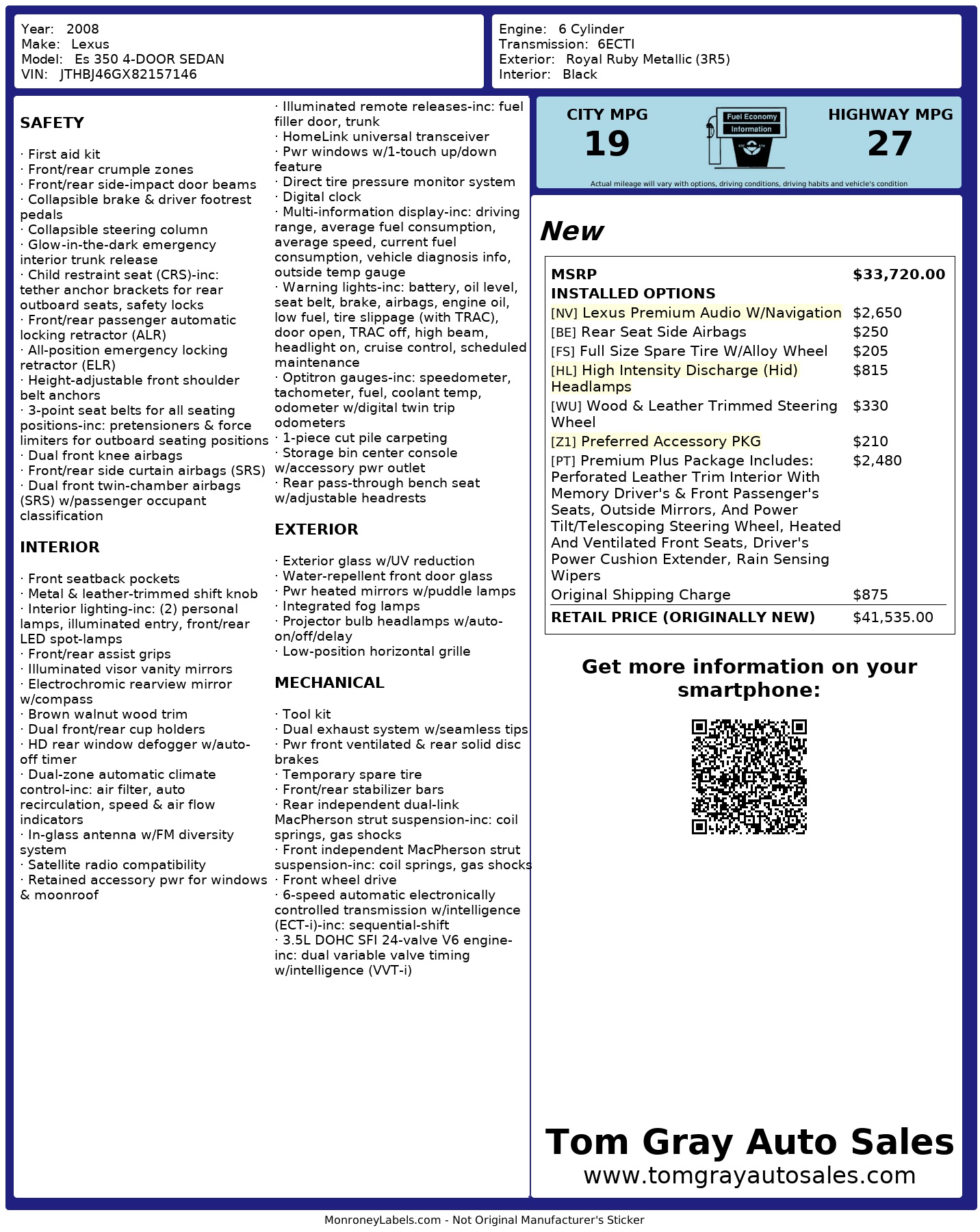 Get ready to hit the road in style with this sleek Burgundy 2008 Lexus ES 350! Powered by a robust 3.5L V6 engine with dual variable valve timing, this car delivers a smooth and powerful ride with its 6-speed automatic transmission. The front and rear independent suspension ensure a comfortable drive, while the progressive power rack & pinion steering makes maneuvering a breeze.