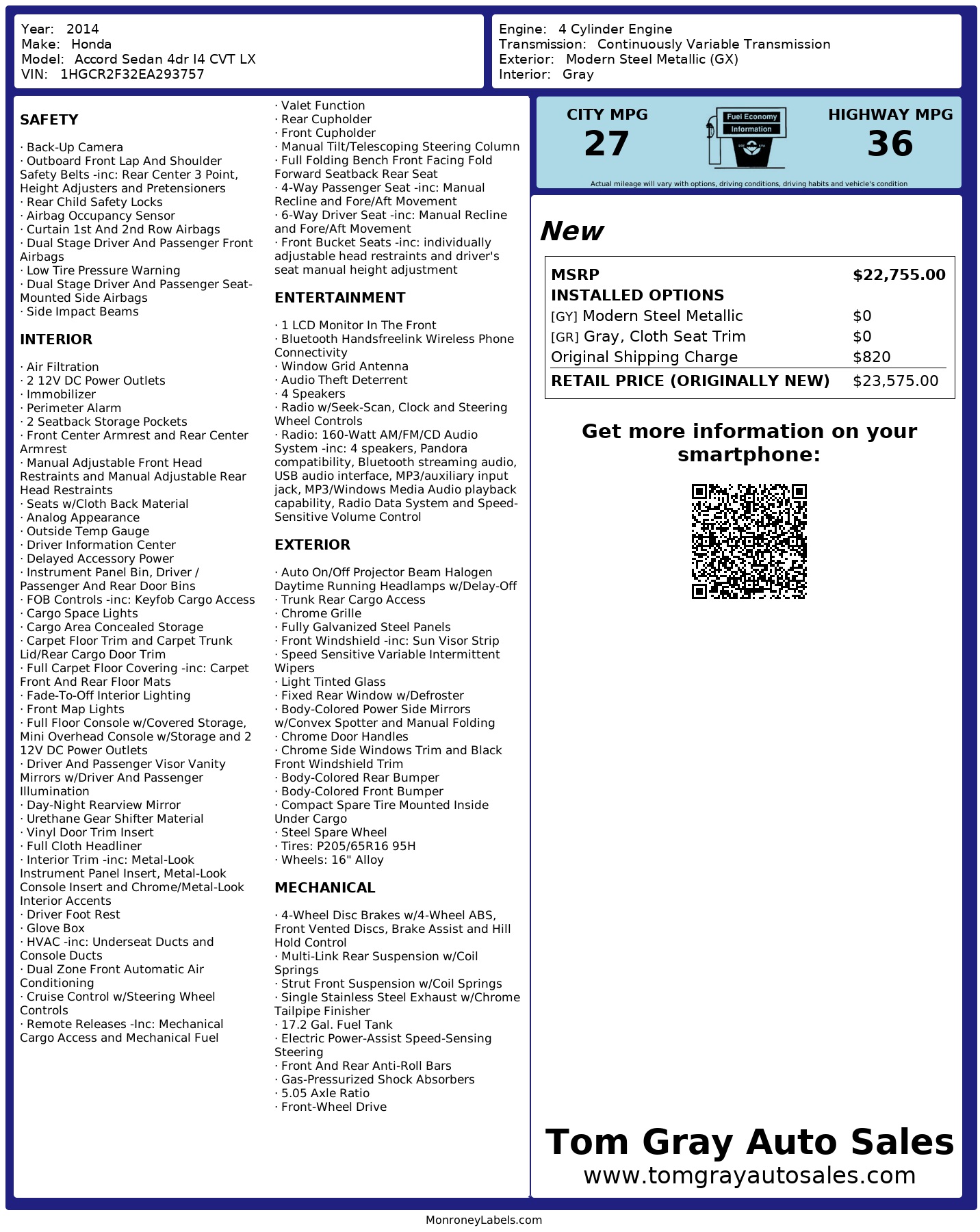 Introducing the stylish and reliable 2014 Honda Accord Sedan in timeless Gray! This well-maintained vehicle comes equipped with a fuel-efficient 2.4L 16-Valve DOHC i-VTEC I-4 engine paired with a Continuously Variable Transmission for a smooth ride. The modern design features chrome accents, 16" alloy wheels, and sleek body-colored exterior details. Step inside to find a comfortable interior with spacious seating for five, Bluetooth connectivity, and a user-friendly audio system with Pandora compatibility. Drive with confidence knowing that this Honda Accord has passed a thorough inspection, and a Carfax report is available upon request. Safety features include dual-stage airbags, a rearview camera, and traction control for added peace of mind. Don't miss out on this fantastic opportunity to own a high-quality pre-owned vehicle that combines style, efficiency, and reliability. So, grab the keys and hit the road in this fantastic Honda Accord Sedan - the perfect blend of performance and practicality!