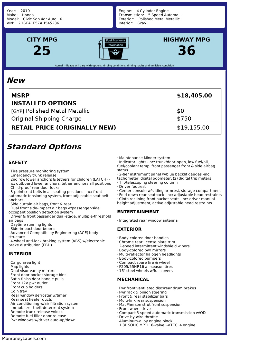 The exterior of this Civic is eye-catching with its body-colored bumpers, halogen headlights, and chrome rear license plate trim. Inside, you'll find comfortable cloth reclining front bucket seats and a convenient center console with storage. The 2-tier instrument panel features blue backlit gauges for a modern touch.