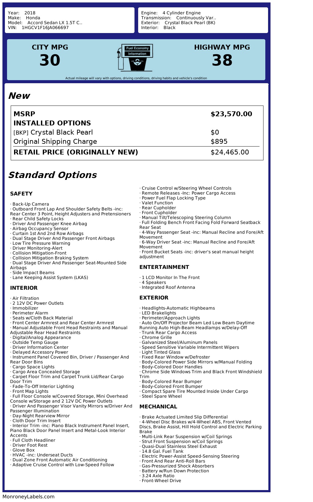 Introducing a sleek and stylish Black 2018 Honda Accord Sedan with a turbocharged engine that packs a punch. This beauty comes equipped with a continuously variable transmission and front-wheel drive, making every drive smooth and enjoyable. With its striking body-colored exterior and chrome accents, this sedan is sure to turn heads wherever it goes. Step inside to find a spacious interior with comfortable cloth seats and convenient amenities like dual-zone automatic air conditioning and adaptive cruise control. Safety is a top priority with features like a lane-keeping assist system and collision mitigation technology to keep you and your passengers secure. The carfax report available gives you peace of mind knowing the vehicle's history. Whether you're running errands around town or hitting the open road, this Honda Accord is ready for any adventure. Don't miss out on the opportunity to own this reliable and efficient sedan that combines style, performance, and safety all in one package.