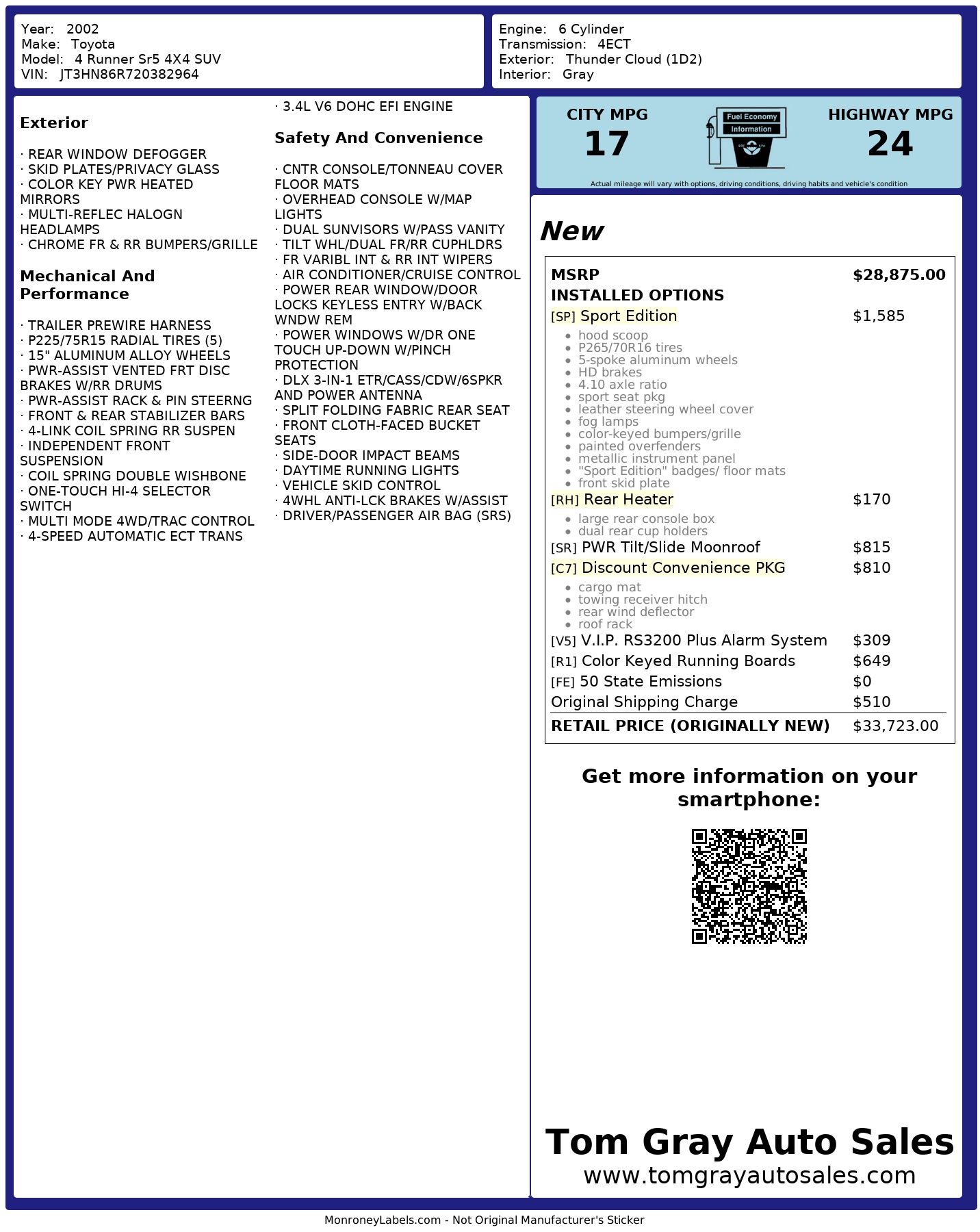 Get ready to hit the road in style with this shiny Silver 2002 Toyota 4Runner! Equipped with a powerful 3.4L V6 engine and a multi-mode four-wheel drive, this SUV is ready for any adventure you throw its way. Whether you're cruising through the city streets or tackling off-road trails, the front suspension/fuel tank skid plates and transfer case skid plate offer added protection. The chrome front/rear bumpers and grille give this 4Runner a sleek look, while the privacy glass adds a touch of mystery.