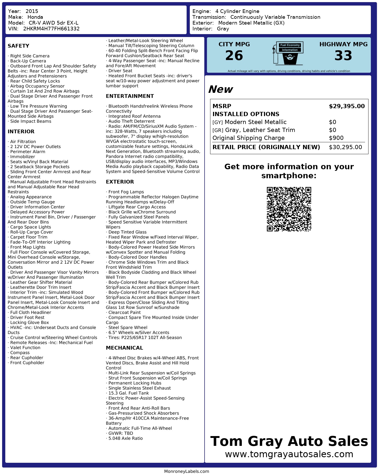 Hop into this sleek and sporty 2015 Gray Honda CR-V and let the good times roll! This well-maintained beauty is powered by a reliable 2.4L I-4 engine with automatic full-time all-wheel drive, making it the perfect companion for all your adventures. Cruise around town with ease with the continuously variable transmission and sport mode, while enjoying a smooth ride with gas-pressurized shock absorbers and front/rear anti-roll bars.
