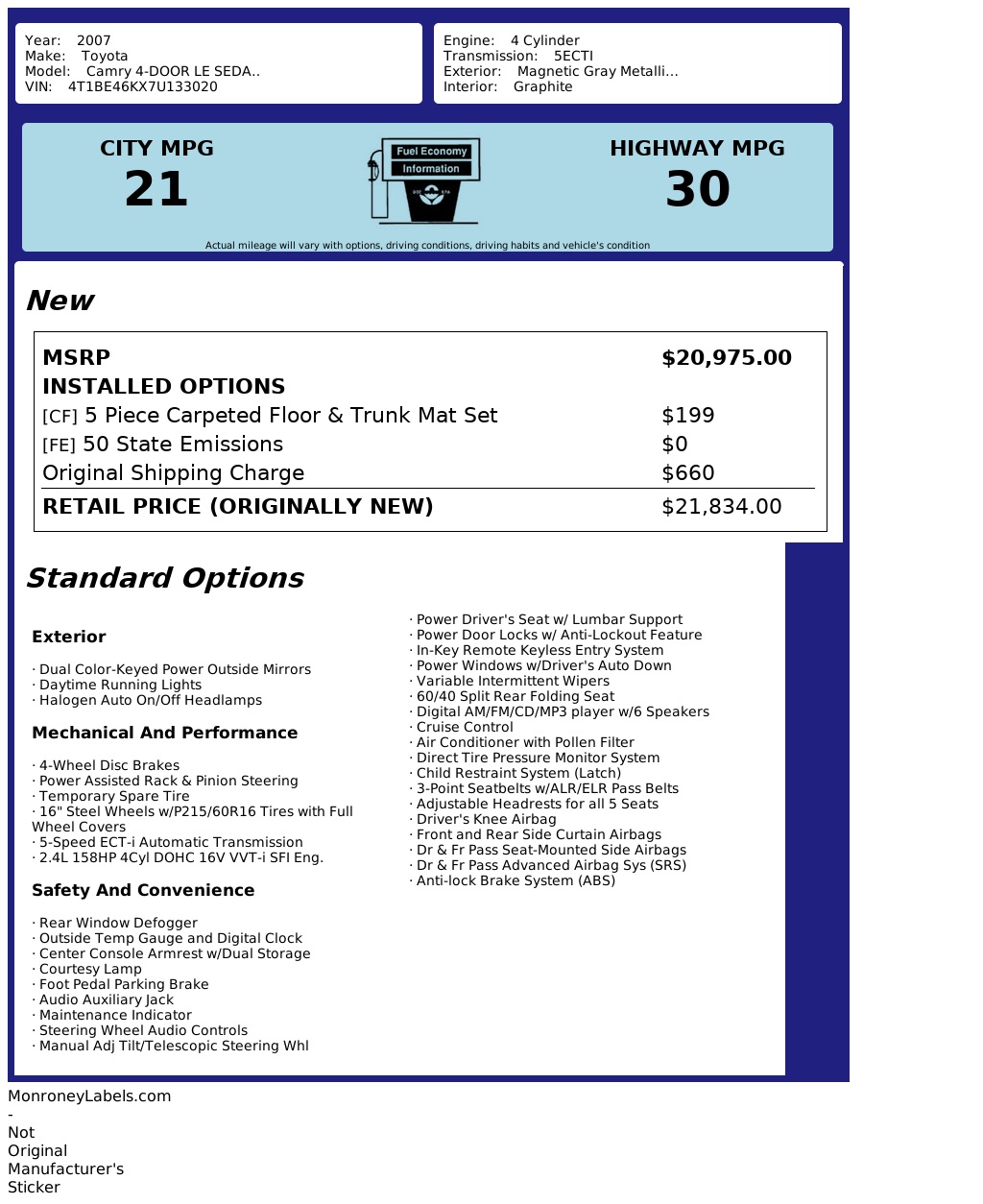 Hop into this sleek 2007 Toyota Camry and get ready to hit the road in style! With a reliable 2.4L 4-cylinder engine under the hood, this car is perfect for cruising around town. Take on any adventure with confidence thanks to its front-wheel-drive capability and smooth handling. Whether you're driving through the city or cruising on the highway, the Camry's pwr front ventilated brakes and variable assist steering will ensure a safe and enjoyable ride.Inside, you'll find comfortable front bucket seats with adjustable features for ultimate comfort. Stay in control with the tilt/telescoping steering wheel that includes convenient audio controls. With advanced airbags, side curtain airbags, and a tire pressure monitor system, you can drive with peace of mind knowing you're protected.