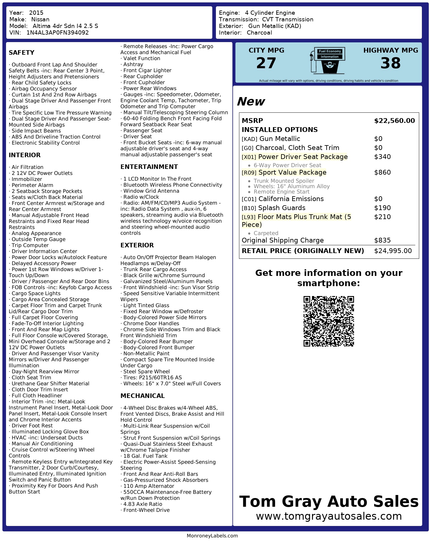 Get ready to zip around town in style with this sleek Gray 2015 Nissan Altima! Equipped with a 2.5L DOHC 16-Valve I-4 engine and Xtronic CVT transmission, this front-wheel drive beauty is ready to hit the road with you behind the wheel. From the moment you start the engine, you'll feel the power and responsiveness that this Altima offers. Whether you're cruising down the highway or navigating city streets, you'll appreciate the smooth ride provided by the gas-pressurized shock absorbers and front and rear anti-roll bars. With its stylish chrome accents and body-colored exterior, this Altima is sure to turn heads wherever you go. And don't worry about safety - this car is equipped with dual stage driver and passenger airbags, as well as curtain 1st and 2nd row airbags. Plus, you can drive with peace of mind knowing that a Carfax report is available for this vehicle. So why wait? Come test drive this sporty Altima today and experience the fun and excitement for yourself!