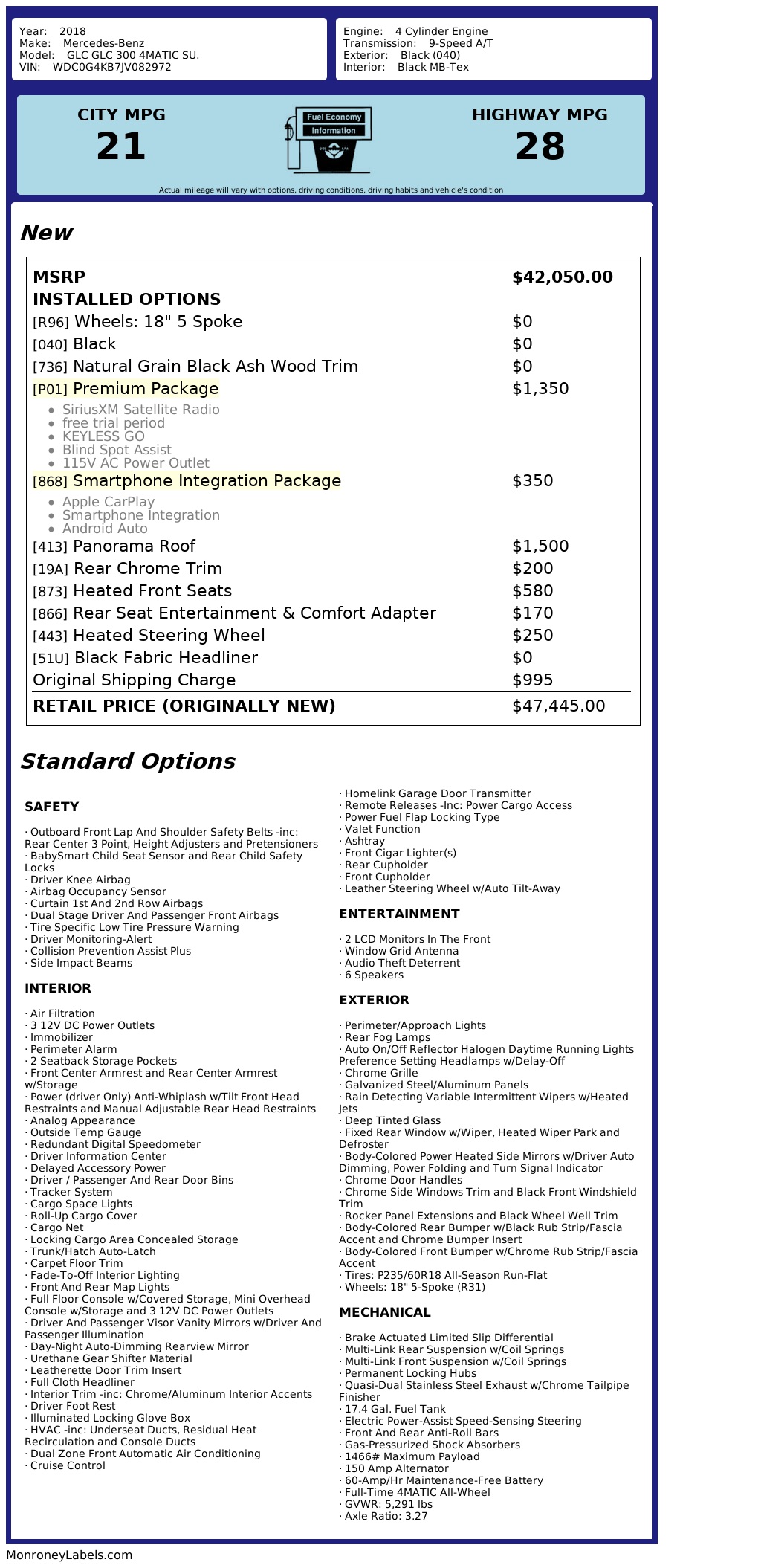 Cruise around town in style and luxury with this sleek Black 2018 Mercedes-Benz GLC! This beauty is powered by a 2.0L Turbo 4-Cylinder engine and features a full-time 4MATIC All-Wheel Drive system for a smooth and powerful ride. With its striking chrome accents, 18" 5-Spoke wheels, and elegant body design, you'll turn heads wherever you go. Step inside the plush interior, complete with leather steering wheel, dual-zone automatic climate control, and a premium sound system with 6 speakers for the ultimate driving experience. Stay connected on the go with Bluetooth connectivity and 2 LCD monitors in the front. Your safety is a top priority with features such as Collision Prevention Assist Plus, airbags throughout, and a Tire Specific Low Tire Pressure Warning system. Plus, rest assured with the available Carfax report for added peace of mind. Don't miss out on this luxurious and reliable Mercedes-Benz GLC - it's ready to hit the road with you at the wheel!