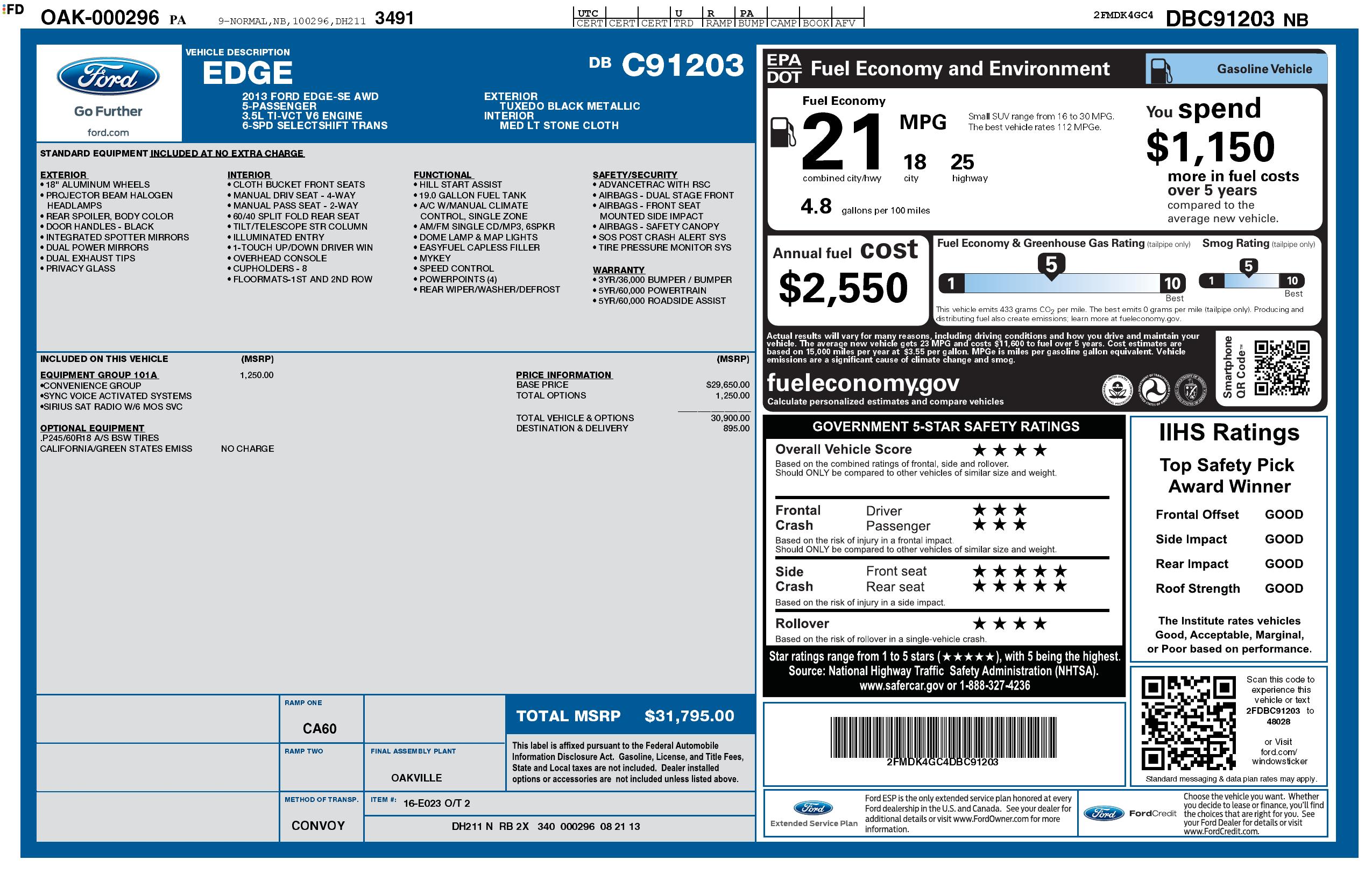Cruise around in style in this sleek Black 2013 Ford Edge! With its 3.5L Ti-VCT V6 Engine and all-wheel drive, this beauty is ready to take you on all your adventures. The aerodynamic design is enhanced by the body-color rear spoiler, black rocker moldings, and chrome grille, making heads turn wherever you go.